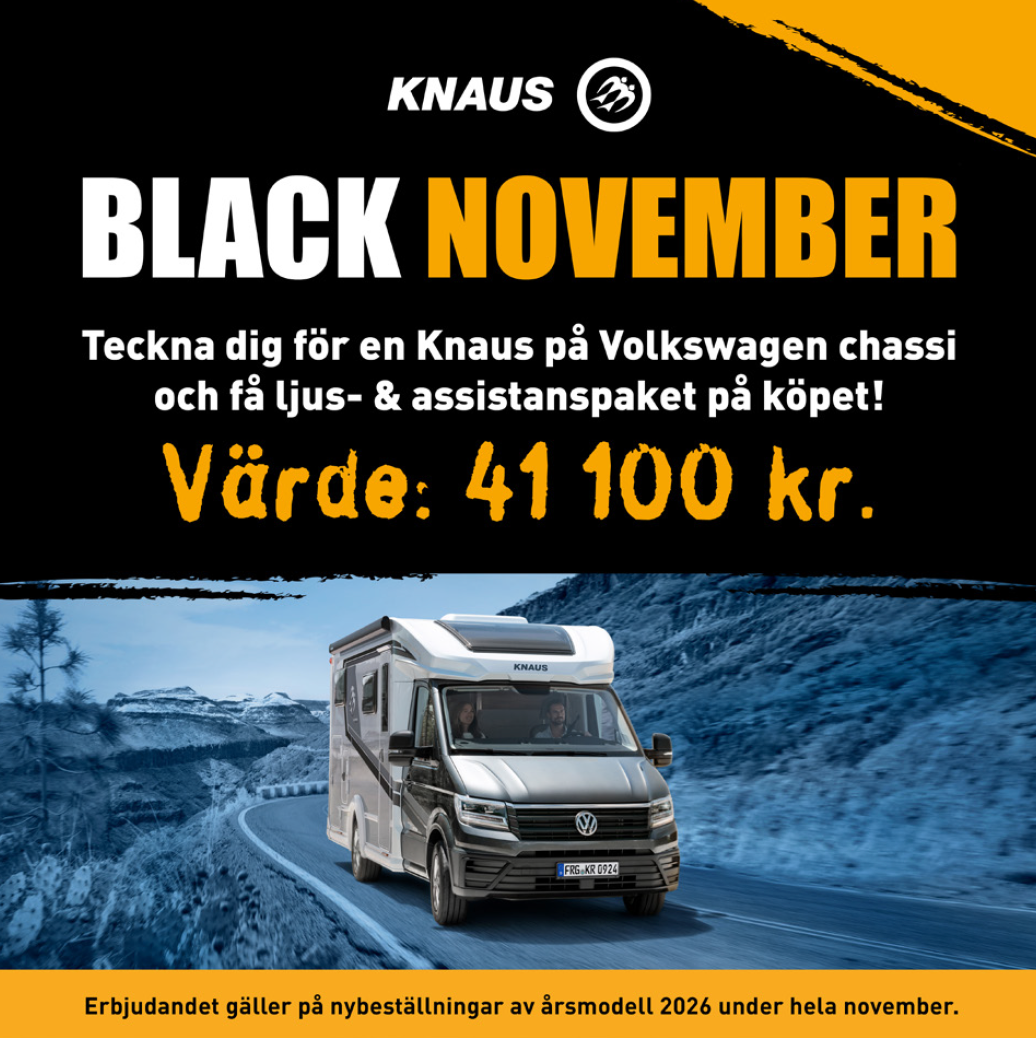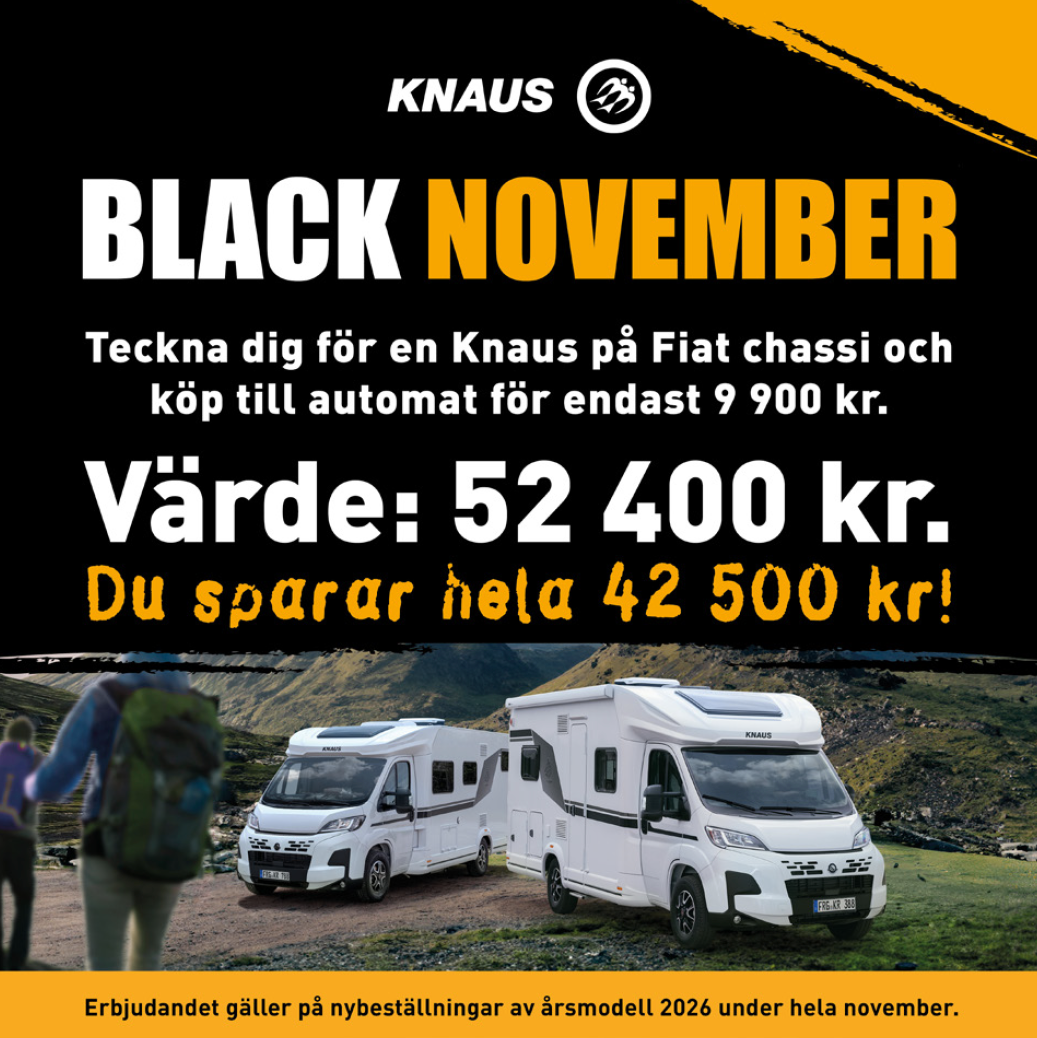 Vi firar Black November med unika Knaus‑erbjudanden och massor av prissänkta husvagnar i lager.