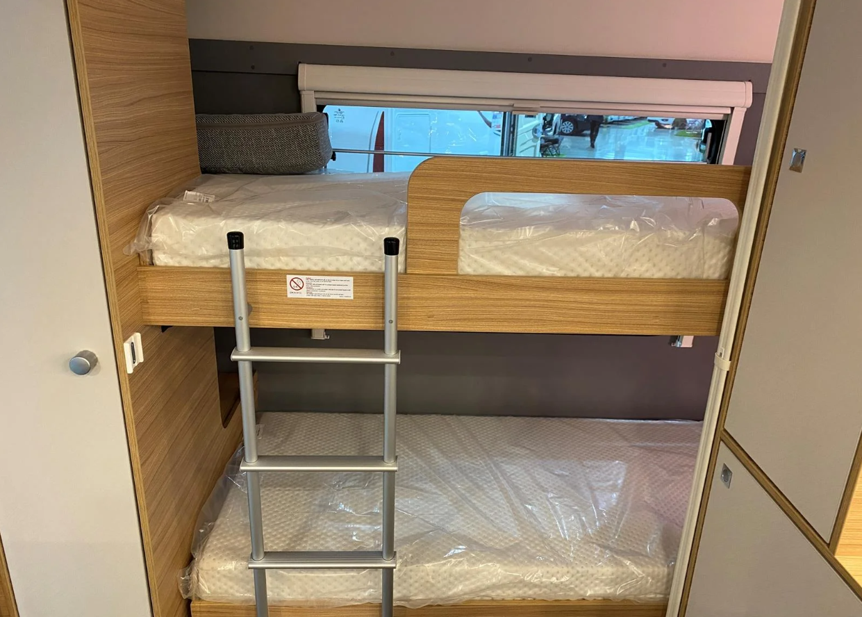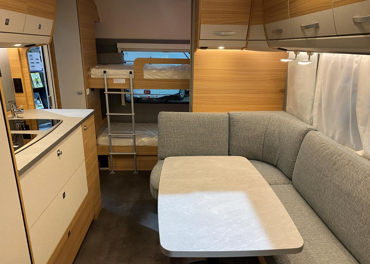 5,99 m lång. Dubbelbädd höj och sänkbar, 3500 kg totalvikt, 3 bäddar / 4 färdplatser.